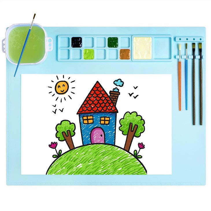 3. Dan it-tapit ta 'l-arti tas-silikonju aġġornat fih żewġ trejs ta' żebgħa tondi mdaqqsa għal taħlit effettiv, tazza tat-tindif tal-pinzell li tista 'tiġġarrab, u l-abbiltà li tintuża bħala paletta taż-żebgħa u pallet. Dan it-tapit tal-kreatur tas-silikon għandu skali fuq ix-xellug u l-qiegħ li huma aktar prattiċi għall-produzzjoni artistika tiegħek.
