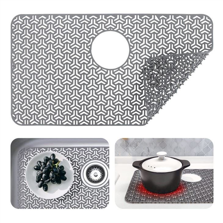 2. Reżistenti għas-sħana: Is-silikonju huwa reżistenti għas-sħana, sabiex tkun tista 'tuża t-tapit tas-sink tiegħek bħala trivet biex tipproteġi l-countertops tiegħek minn qsari u twaġen sħan.